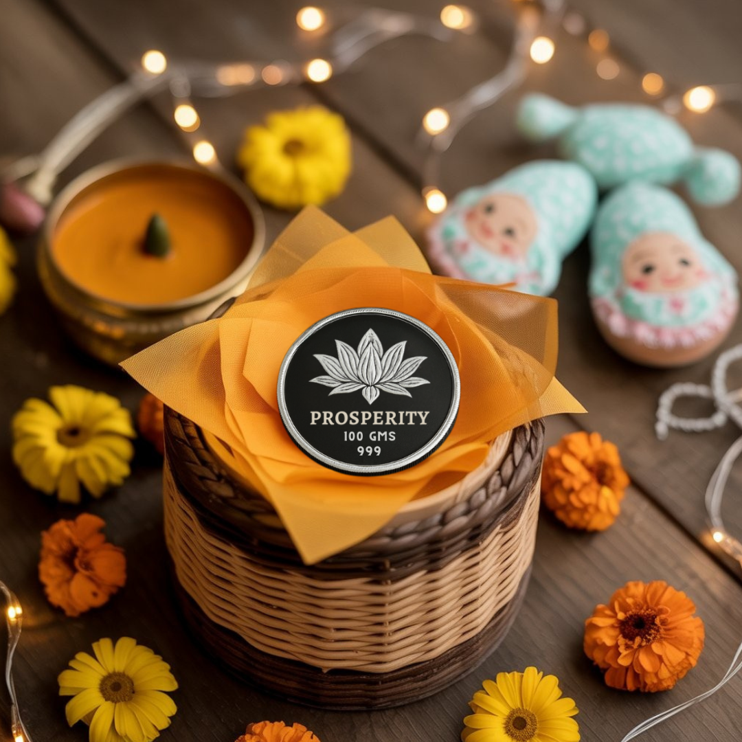 Silver symbolizes emotional balance and strengthened bonds, making it an ideal gift for weddings, birthdays, and spiritual occasions. It holds lasting value both materially and spiritually, representing prosperity and the blessings of Goddess Lakshmi.